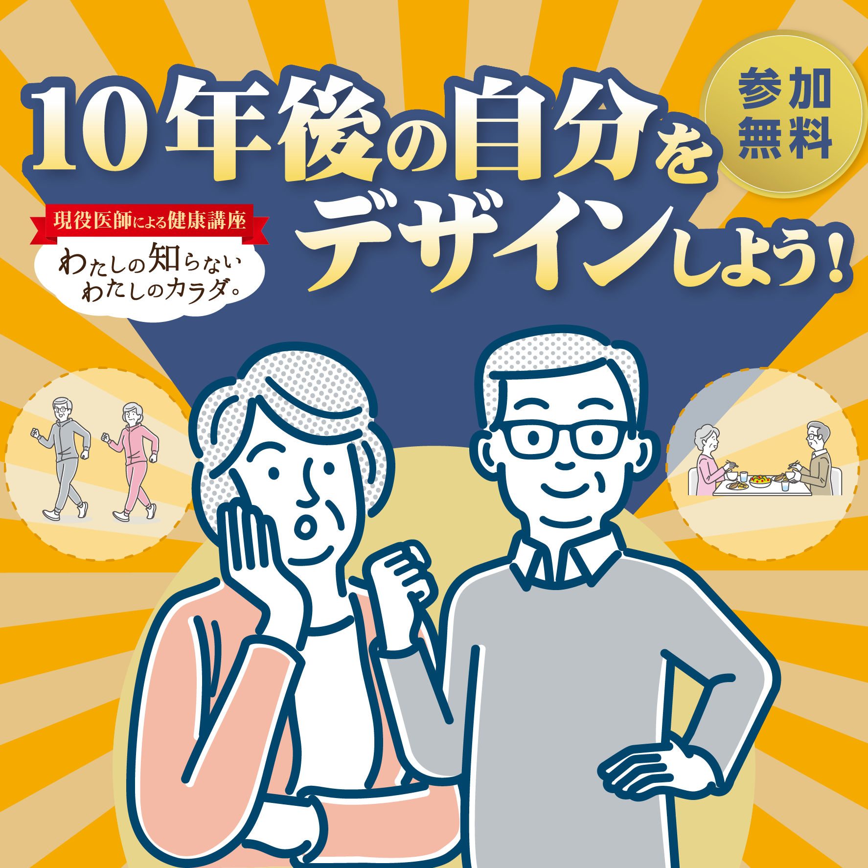そんなあなたに、自分の健康習慣を振り返り、10年後の元気な自分をデザインするヒントをお届けするセミナーです。医師の解説や参加型ワークショップ・クイズを交えて、楽しく学びながら自分の習慣を見直せます。