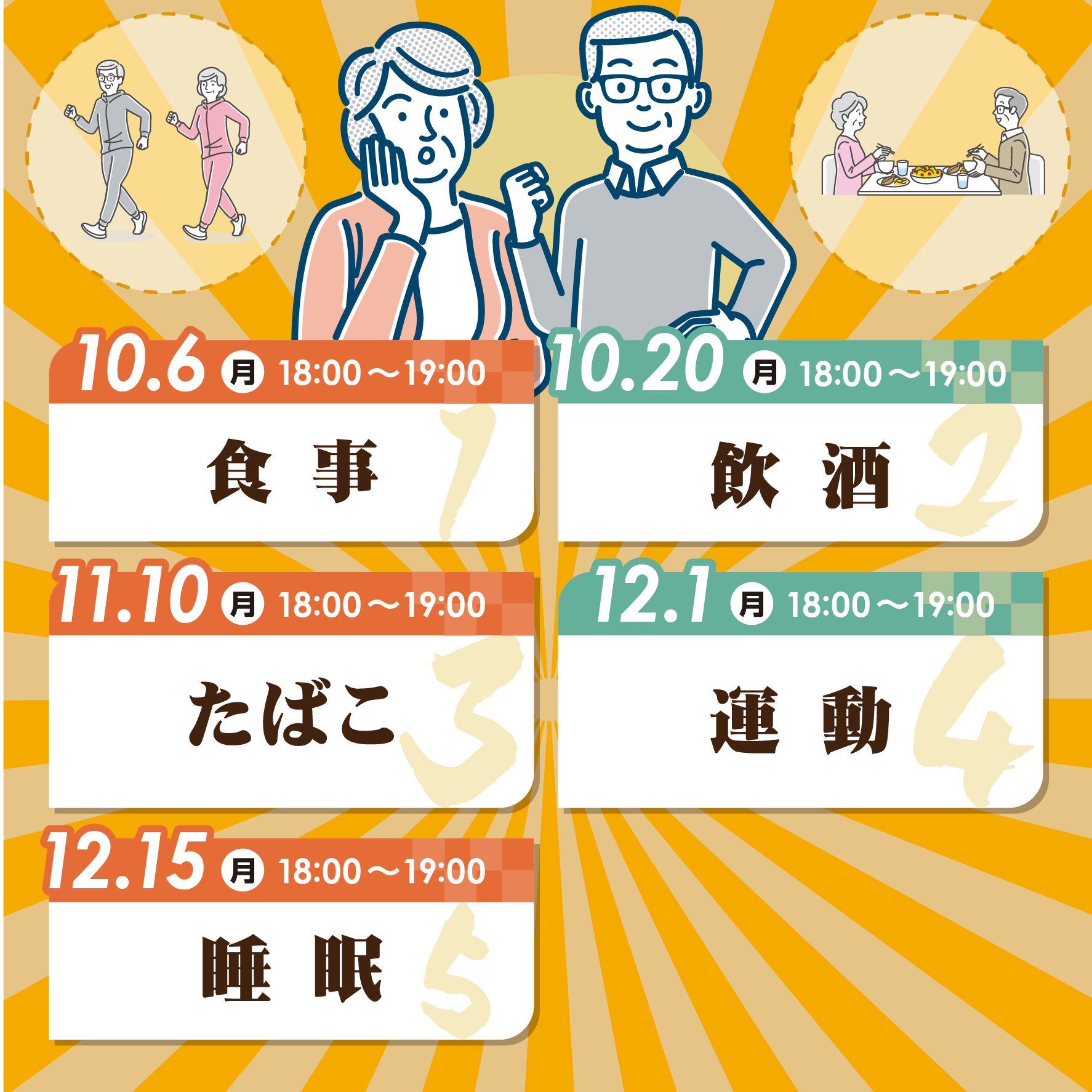 食事、飲酒、たばこ、運動、睡眠